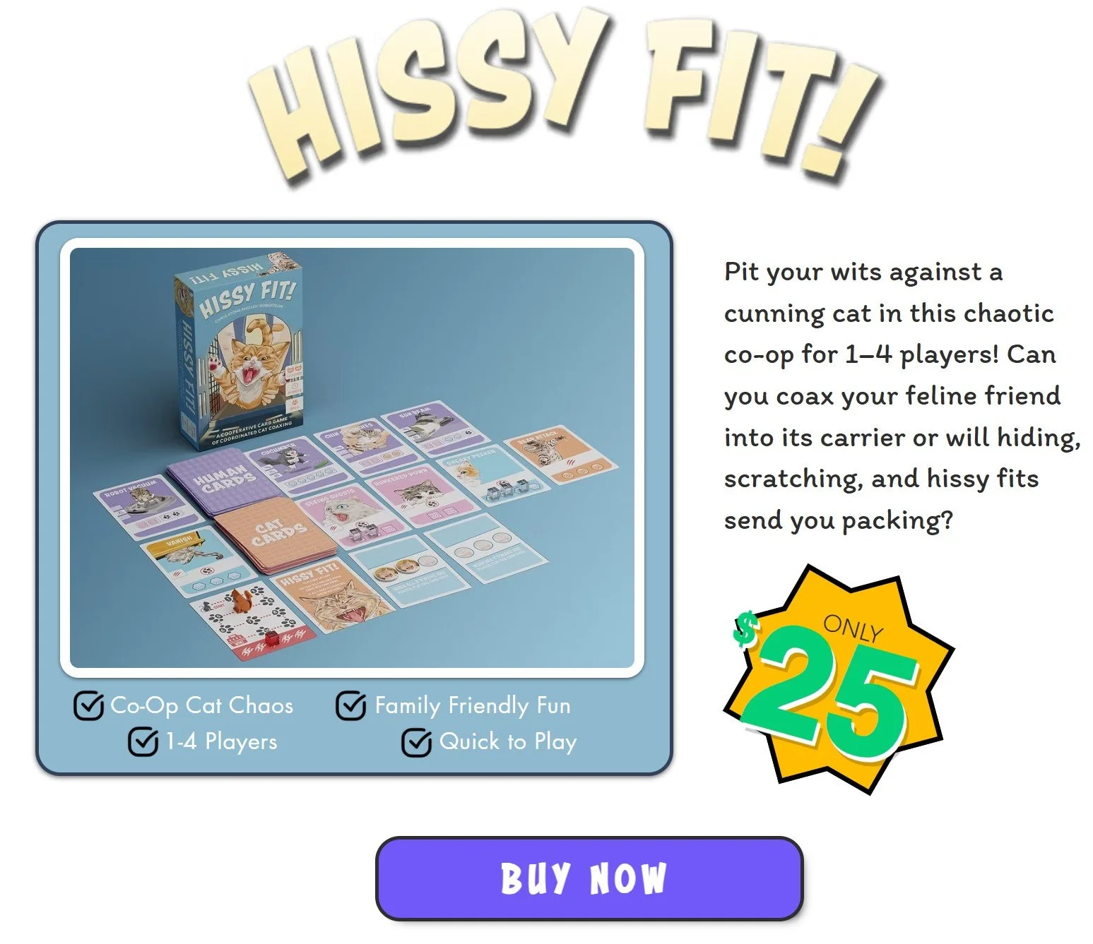 From sudden sneak attacks to clever hiding spots, Cat Cards pile on chaos each turn. Survive the scratches, contain the hissy fits, and outsmart your cat - if you don’t, the furry troublemaker wins!